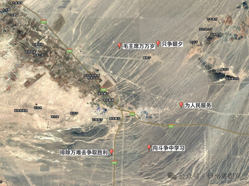 新京报讯 据“伊州零距离”微信公众号报道,在哈密市东南部戈壁深处,存在着五个“为民服务”和“日日”巨型群体。