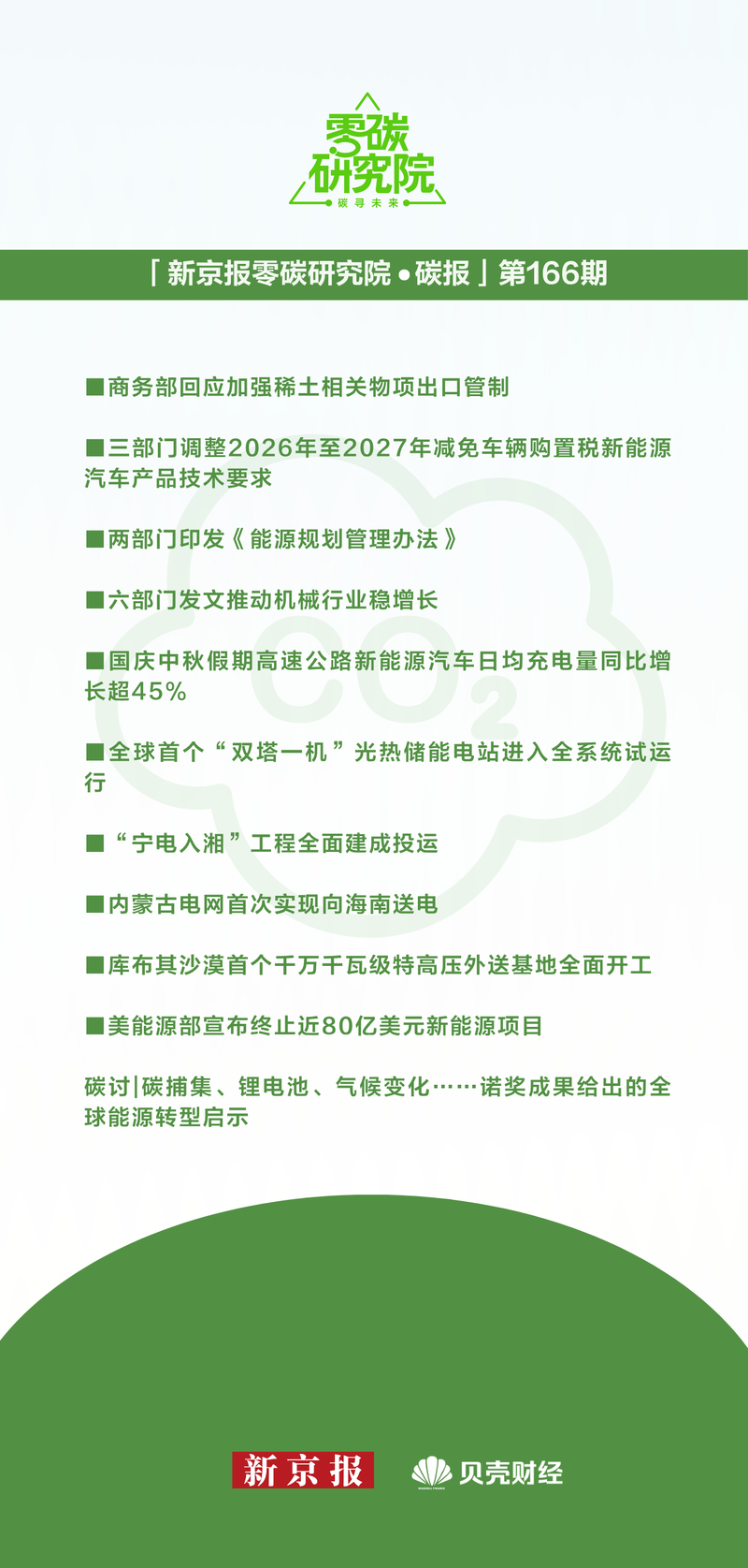 一、双碳动态 一、政策发布 1、商务部回应加强稀有土地相关物品出口管制。根据《中华人民共和国出口管制法》、《中华人民共和国两用物项出口管制条例》等相关法律法规,10月9日,经国务院批准,商务部发布公告。 2025年第61号令对一些含有中国成分的与地球有关的稀有物品实施出口管制。与土相关的稀有物品具有双重使用的特点,对其实施出口管制是国际上的通行做法。今年4月,中国政府对中国及个人组织的稀有土地产品出口实施出口管制。相关稀土技术早在2年就被列入我国禁止和限制出口技术目录001、一段时间以来,一些境外组织和个人将原产于中国的稀土管制物项直接或经过加工后向有关组织和个人转让、提供,并直接或间接用于军事等敏感领域,对中国国家安全和利益造成重大损害或潜在威胁,对国际和平稳定造成不利影响,破坏国际努力。为此,中国政府依法对一些含有中国成分的稀有土地物项实施管制,目的是为了更好地维护国家安全和利益,更好地履行防扩散等国际义务。零碳解读:稀有土地相关物品具有双重利用的特点,这是世界范围内对其实施出口管制的技巧。今年4月,中国政府实施出口管制对一些稀有土地物品的控制。相关稀有技术已于2001年初被纳入中国禁止和阻止出口的技术目录。相关出口须遵守法律要求。 2、三部门调整2026年至2027年减免车辆购置税的新能源汽车产品技术要求。10月9日,工业和信息化部、财政部、国家税务总局联合公布了2026年至2027年减免车辆购置税的新能源汽车产品技术要求,明确了纯电动乘用车和插电式(包括 增程)混合动力电动乘用车。公告称,纯电动乘用车每百公里电能消耗不应高于用电量《电动汽车用电量限值第1部分:乘用车》相应车型的用电量限值。公告指出,自2026年1月1日起,纳入《新能源汽车减税车辆开放车型目录》的车型须符合本公告要求。自2026年1月1日(含)起,2026年及以后生效的免税目录发布后,购买纳入免税目录的新能源汽车可按规定享受购置税购置政策。零碳解读:此次公告主要针对2026年至2027年新的车辆购置税减税,大幅提高了技术门槛,引入了更新的国家标准,并对车辆能耗和电池寿命提出了更严格的要求。对于制造商来说,时间窗口很紧,技术和产品不断变化产能需要提前部署,否则将面临目录资格和市场份额的损失。 3、两部门9月30日发布《能源规划规划办法》。国家发展改革委、国家能源局发布《能源规划规划步骤》。能源规划包括国家综合能源规划、行业能源规划、区域能源规划和省、自治区、直辖市能源规划。本办法适用于上述各类能源规划的研究起草、征求意见、对接论证、审批放行、组织实施、评估和调整。提案提出,国家综合能源规划、国家能源规划和区域能源规划是国家指导和本地区相关能源发展的重要依据,组织重大工程引导项目建设,合理提供公共资源,引导社会资本投资,并制定相关政策。能源规划是企业做好项目前期工作的重要依据。也是能源工程项目审批(核准)机关和自然资源、生态环境、住房城乡建设、行业管理、金融机构等部门审查工程工程相关项目的依据。零碳解读:能源规划对能源发展具有重要引领作用。近年来,在规划工作开展的基础上,我国近期出台了《能源管理规划办法》、《能源规划管理办法》等能源规划政策。随着发展形势的变化,TRi规划气味也面临着一些新情况、新要求。它有时需要继续并改进。例如,我要加大同导向政策考核要求等。四、六部门发文促进机械工业平稳增长。 Noong Setyembre 29,anim na kakawaran kabilang ang the Ministry of Industry and Information Technology, ang Ministry of Agriculture and Rural Treatment, at ang Ministry of Commerce ay magkakasamang naglabas ng "plano sa trabaho para sa matatag na paglaki ng industriya ng makinarya (2025-2026)", na nagmumungkahi na mula 预计到2025年、2026年,平均营业收入增长3.5%左右,营业收入突破10万亿元,培育一批有竞争力的中小规模NG商业产业集群和具有国际竞争力的集群。规划要求供需双方共同努力,多方合作,激发行业增长活力。提出14项重点任务三是加大实施制造业关键技术改造和大型装备更新工程力度;进行数字化转型和转型行动;支持工业主板、机器人、智能测试设备等研究、验证和集成改造;加强机械行业通用大机型和大型机型的研发;重点纠正不合理竞争行为,引导行业协会、房商等行业组织加强行业自律,促进行业正当发展和良性竞争。零碳解读:机械工业是为国民经济、国防工业和民生提供技术装备的重大性、战略性、先导性产业。这是工业经济的“压舱石”。当前,机械行业面临的问题外部冲击影响加大,内需不足、非理性竞争加剧等。行业稳定运行面临挑战。该规划旨在推动机械工业高质量发展,支撑工业经济稳定运行。 B.行业趋势 5、国庆、中秋期间,车道内新能源汽车日均充电量同比增长45%以上。据国家能源局统计,10月1日至8日,全国道路新能源汽车日均计费量同比增长45%以上。具体来说,通过对纳入国家充电设施监测服务平台的4.84万辆公路车辆进行监测,对道路充电设施(枪)进行统计分析显示,10月1日至10月8日24:00,道路上的新能源汽车将全部充电。共充电516.9万次,共充电5次,即1.23亿千瓦时。今年国庆、中秋假期期间日均开单量为2.59Beyes,较今年五一假期增长23.61%,较去年国庆假期增长45.73%,创下新高纪
