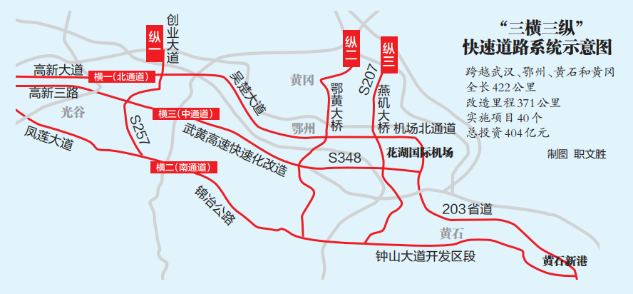 “三横”是:“横一”(北通道)利用高新大道运行光谷,经吴楚大道连接鄂州主城,到达花湖国际机场,经黄石沿江接203省道至黄石新港; “横2”(南通道)利用凤联大道(舞阳高速辅助路)贯穿光谷南部,龙山潜山、五塔斯湖通过金叶公路与宝安湖、黄石临空经济区相连,经大冶湖新区与中山大道相连至黄石新港; “横三”(中通道)是一条规划建设的通道,通过武黄高速城市快速路改造,西接高新三路,东接全省348个省份。h 花湖国际机场。